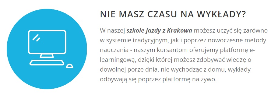 Prowadzona przez nas szkoła nauki jazdy w Krakowie zapewnia elastyczny plan jazd i nauki. Kursanci mogą skorzystać z wykładów stacjonarnych lub platformy e-learningowej.